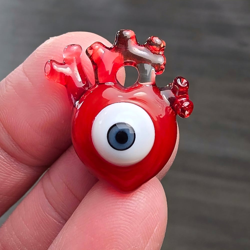 This borosilicate glass anatomical heart pendant was crafted through the alchemical process known as flameworking by crafter Paul N. Doty of Mandella Glass. It expresses his search for meaning in life and the lessons he has learned about himself and the world as a whole. It is a call for others to turn inward in search of their true selves. This heart measures 1" in height. It comes on an adjustable wax cotton cord necklace and in an origami gift box crafted by his wife Kim.