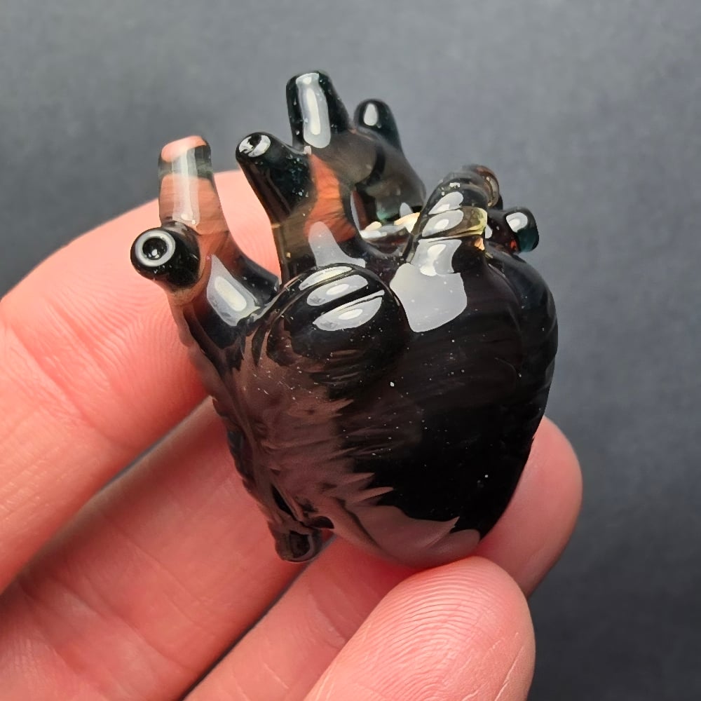 This sparkling dark xxl borosilicate glass anatomical heart pendant was crafted through the alchemical process known as flameworking by crafter Paul N. Doty of Mandella Glass. The exquisite details are a must see in hand to fully appreciate. The heart measures 1 5/8" X 1 3/8". It comes on an adjustable wax cotton cord necklace to wear it on when you receive your package.